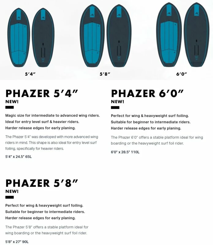 | AK Phazer 5’2 | 20’5 | 46l | n / a | 80 – 100kg | 70 – 90kg | 55 – 75kg |